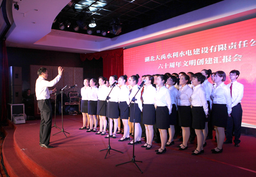 随后,公司80余名员工自编自演了一台精彩纷呈的汇报演出晚会,通过歌舞、小品、诗朗诵、大合唱等形式,充分展示了公司60年来取得的辉煌成就,表现了大禹人奋发向上的精神风貌。在铿锵有力、振奋人心的机关大合唱《团结就是力量》中,汇报演出拉开序幕,喜庆欢乐的气氛顷刻间弥漫整个舞台。《祖国您好》、《江山》、《大禹西藏情》、《水利之歌》、《为了谁》、《健美操》、《明天会更好》……一个个精彩的节目吸引着观众的目光,台下热烈的掌声不时欢声雷动。晚会在歌伴舞《中国梦》的宏大场面中圆满落幕,嘹亮的歌声,饱含着大禹人对公司最真挚的感情和祝愿。