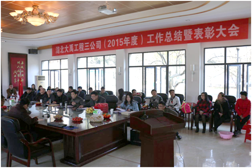 2月27日,猴年新春伊始,湖北大禹工程三公司(2015年度)工作总结暨表彰大会在荆江分洪北闸除险加固工程项目部会议室举行,党支部书记武辉主持会议,三公司经理办公会全体成员、各项目部、办事处相关人员共67人参加会议。