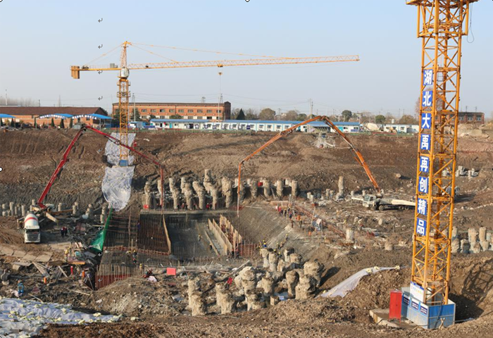 1月9日上午9时,随着项目负责人一声“开仓”令下,樊口二站施工现场迎来了主泵房底板首仓混凝土浇筑。此次主泵房三联底板单仓浇筑方量为1429.43m³,现场采用2台49米天泵入仓。
