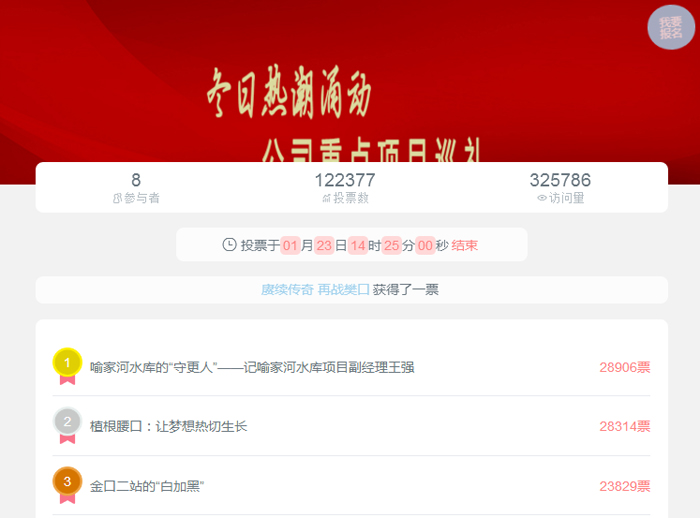 近日,“涌动冬日热潮——重点项目巡礼”活动在一夜之间上了公司“热搜”。一时间,谈话间、微信群、朋友圈,“重点项目巡礼”活动“刷爆了屏”。23日上午,公司在九楼会议室组织召开“重点项目巡礼”活动总结表彰大会。公司总经济师刘克法,总经理助理、工会主席闵国武及机关各部门负责人担任评委,再综合网络投票情况,最终评选《砥砺前行亮剑嘉鱼》、《芳华不负 初心未改》、《大禹的桨》为“创作优秀奖”,《喻家河项目的“守更人”》、《植根腰口:让梦想热切生长》、《金口二站的“白加黑”》为“网络人气奖”,并现场进行了颁奖。