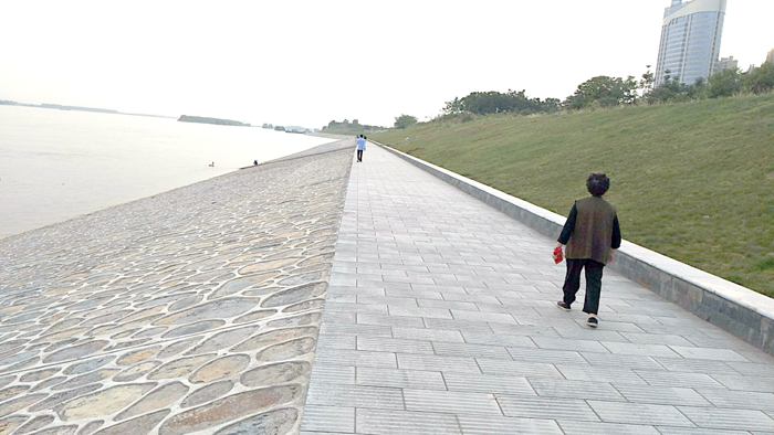 四合垸守护工程结构型式为:以枯水平台为界,上部为两级坡和人行步道,岸顶设有排水沟及压顶,枯水平台外为水下抛石护脚,人行步道以下采用浆砌石护坡,边坡斜坡长22.6m,坡比为1:3.5。人行步道以上采用土工格栅石垫与植草护坡相结合的生态护坡,边坡斜坡长12.2m,坡比为1:2.5。