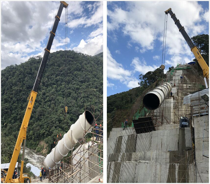 玻利维亚时间2018年5月26日,在项目部完备的安全措施和精准的测量定位下,金结安装部门专业人员从容指挥100吨汽车吊完成了圣何塞2压力钢管明管段首节15米长、30吨重的钢管吊装定位工作。圣何塞2级站明管段总长626米,最大倾角56°,此次吊装的压力钢管位于管槽7#镇墩至8#镇墩间,倾角为40°,吊装定位难度在整个明管段钢管安装中居第二位,本次成功吊装定位揭开了明管段钢管安装序幕,并为后续安装积累了成熟经验,至此2级站上平洞埋管段和管槽明管段钢管安装将同步进行,正向着最终的汇合目标稳步前进。