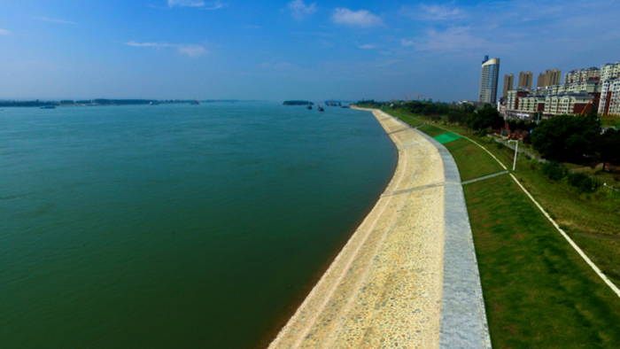 一条宽阔平坦的沿江步道缓缓展开,草地绿意盎然,堤岸工整,这是以长江河道整治为契机而打造出的枝江“最美江岸”。