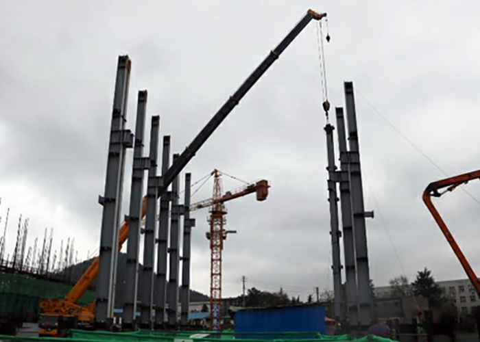 樊口二站工程钢结构共1层,轴线轮廓长度为64.04m,宽度为16.9m,檐口最高标高45.3m,钢柱20.7m,其中一节柱高度3m,二节柱高度17.7m。在顺利通过由建设、监理方组织的出厂验收后,钢结构主要构件已陆续发货、进场、安装。目前一节柱已全部安装完成,正在进行吊装的是主泵房二联的12根二节柱。已安装好的钢柱直插云霄,甚是壮观。