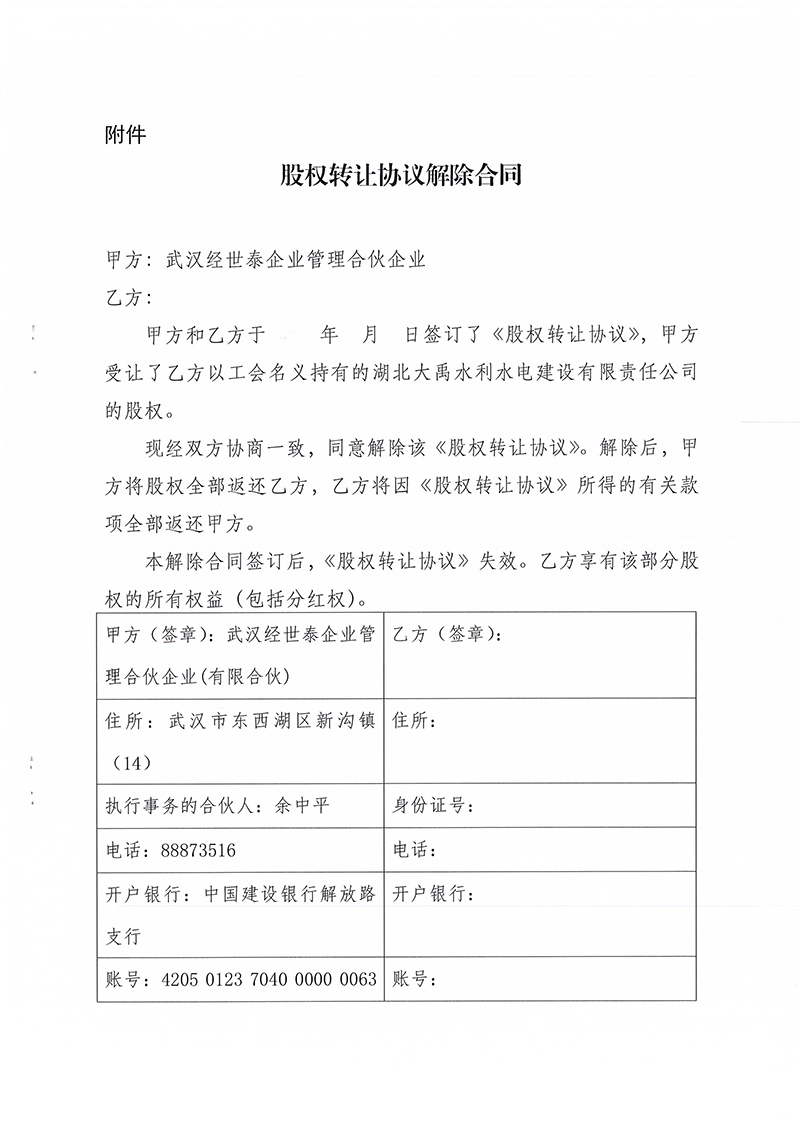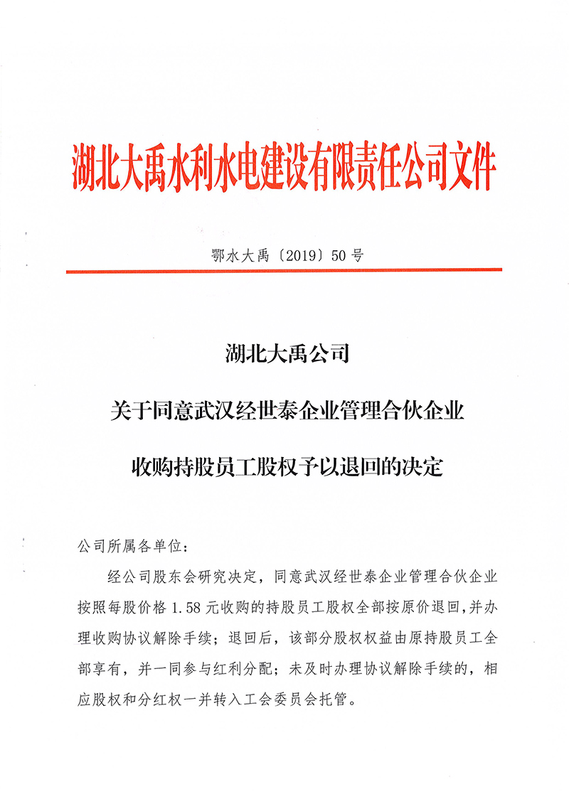 湖北大禹公司关于同意武汉经世泰企业管理合伙企业收购持股员工股权予以退回的决定
