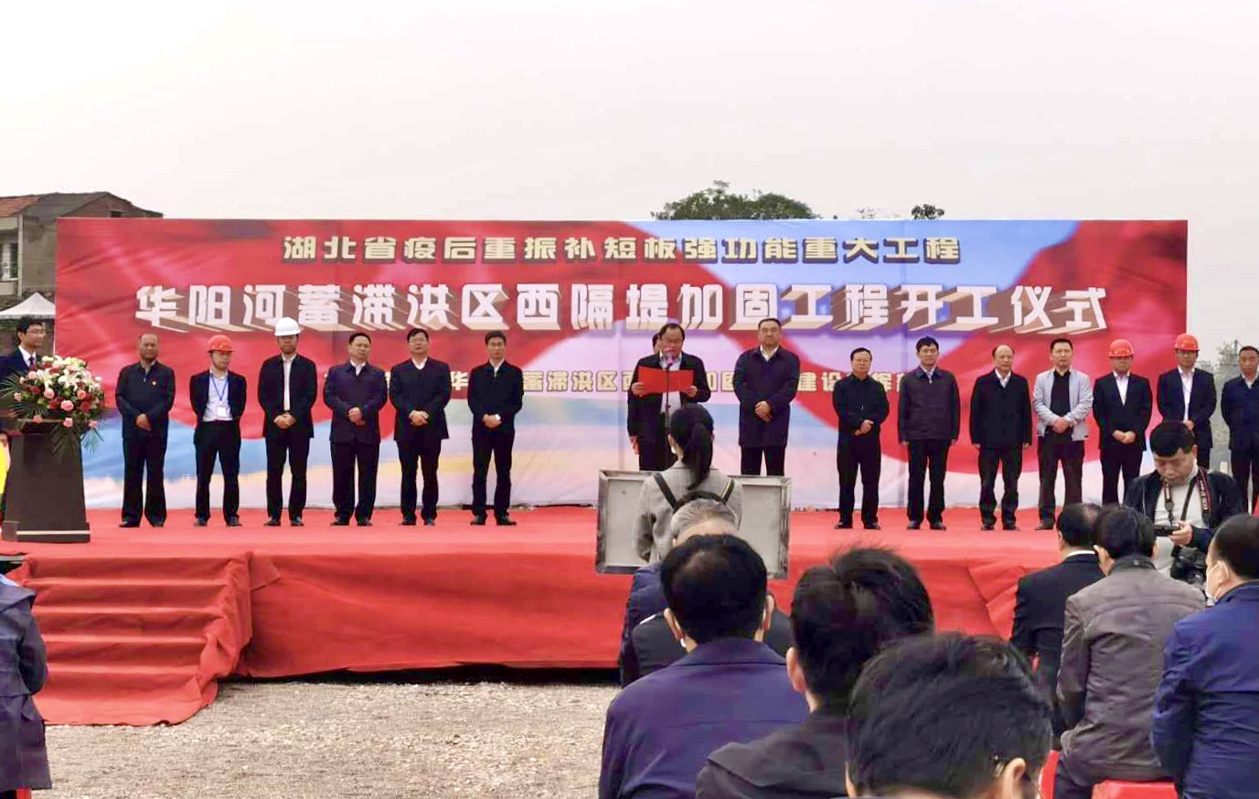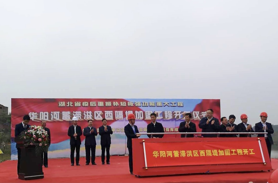 2020年10月19日,华阳河蓄滞洪区西隔堤加固工程开工仪式在黄梅县黄梅镇苗竹林泵站堤段举行。黄梅县委副书记、县长刘裕晓主持,黄冈市政协副主席詹汉彬,黄梅县委书记马艳舟,县委副书记、县委政法委书记高维鹏,县人大常委会主任向博,县政协主席龚家雄等领导以及黄梅县直机关各单位负责人和参建单位代表共二百余人出席开工仪式。公司常务副总经理胡刚参加开工仪式,与参会领导共同按下开工启动球。
