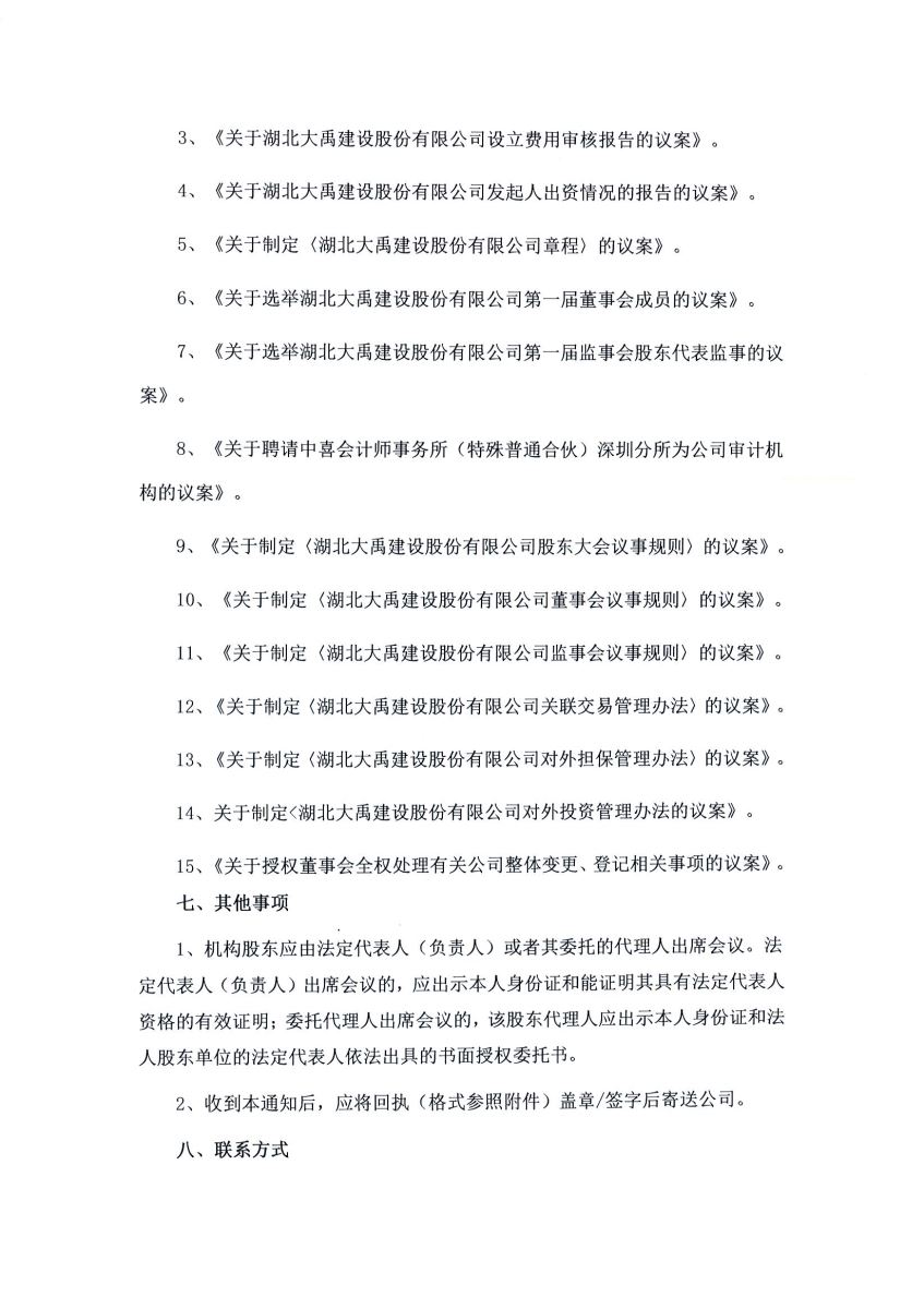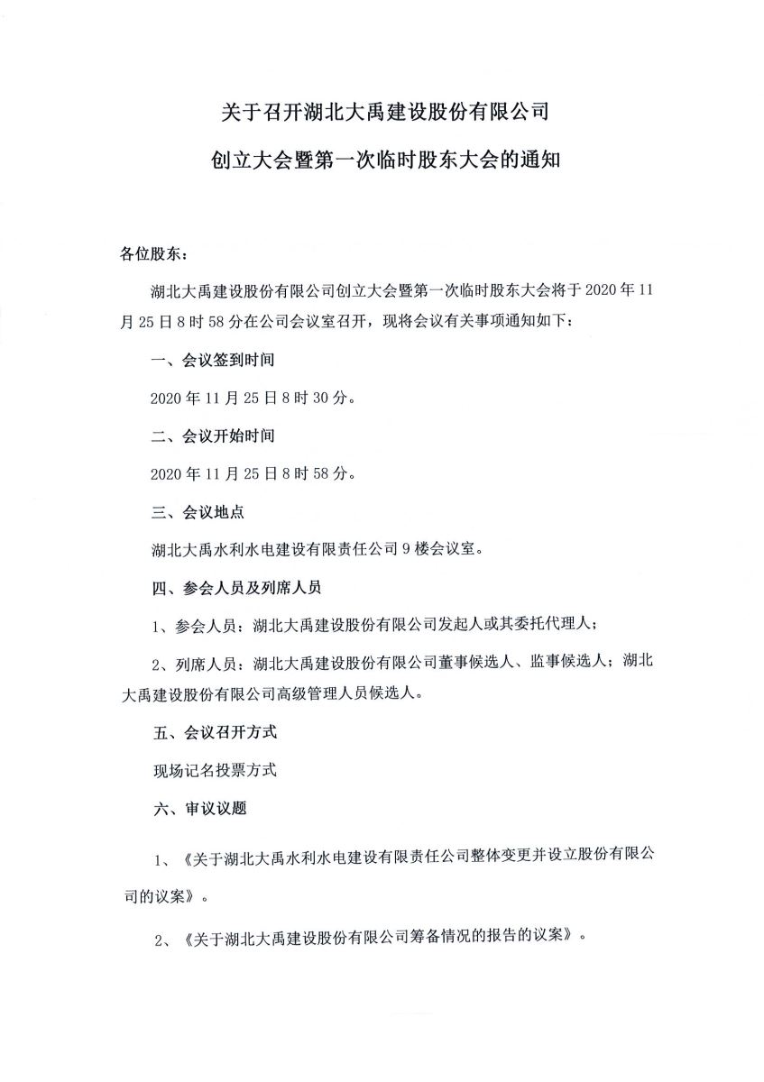 关于召开湖北大禹建设股份有限公司创立大会暨第一次临时股东大会的通知