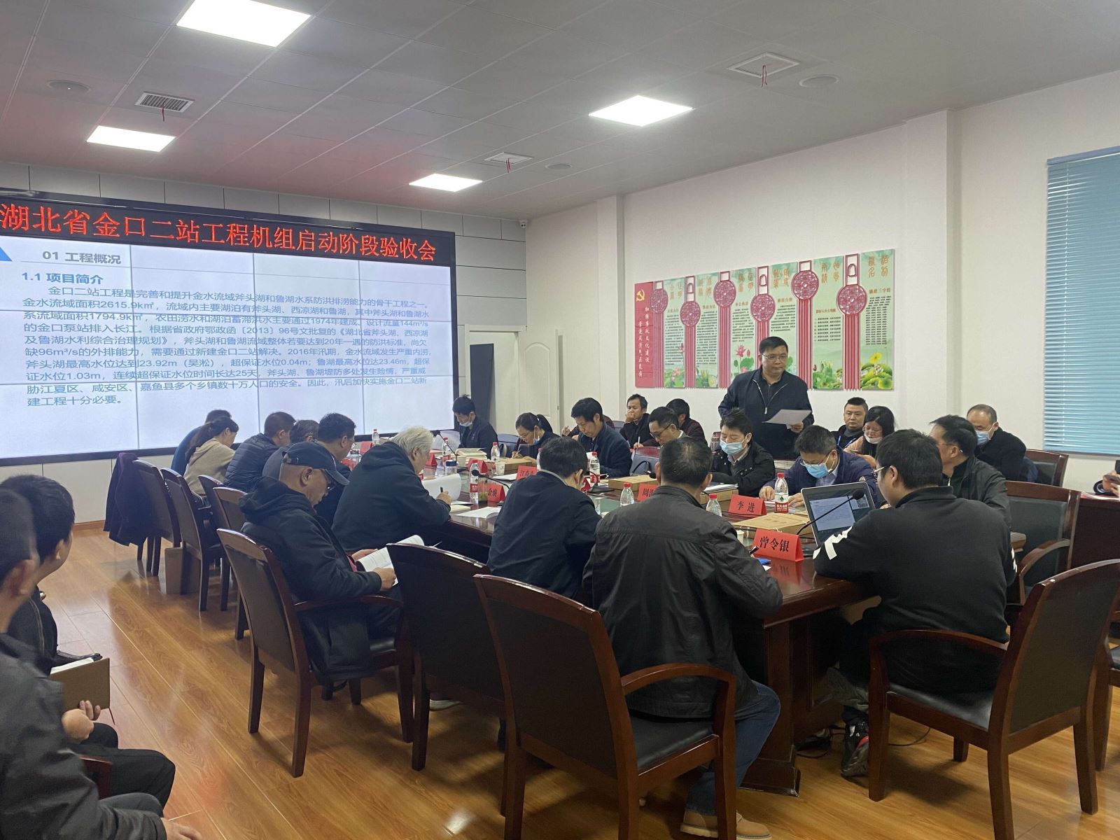 2020年11月19日,项目负责人组织召开了“金口二站机组启动阶段验收”。省水利厅二级巡视员江焱生任主任委员、省水利厅建设处二级调研员孙敬学任副主任委员、省水利厅湖泊处副处长刘英萍任副主任委员,省水利厅湖泊处李进、省水利工程建设监督中心四级调研员周海燕、省水利厅建设处四级调研员马荣辉等11位委员组成了验收委员会。江夏区水务和湖泊局、江夏区河道堤防管理总段、监理、总承包、设计、施工、设备制造厂等单位派员参加会议。