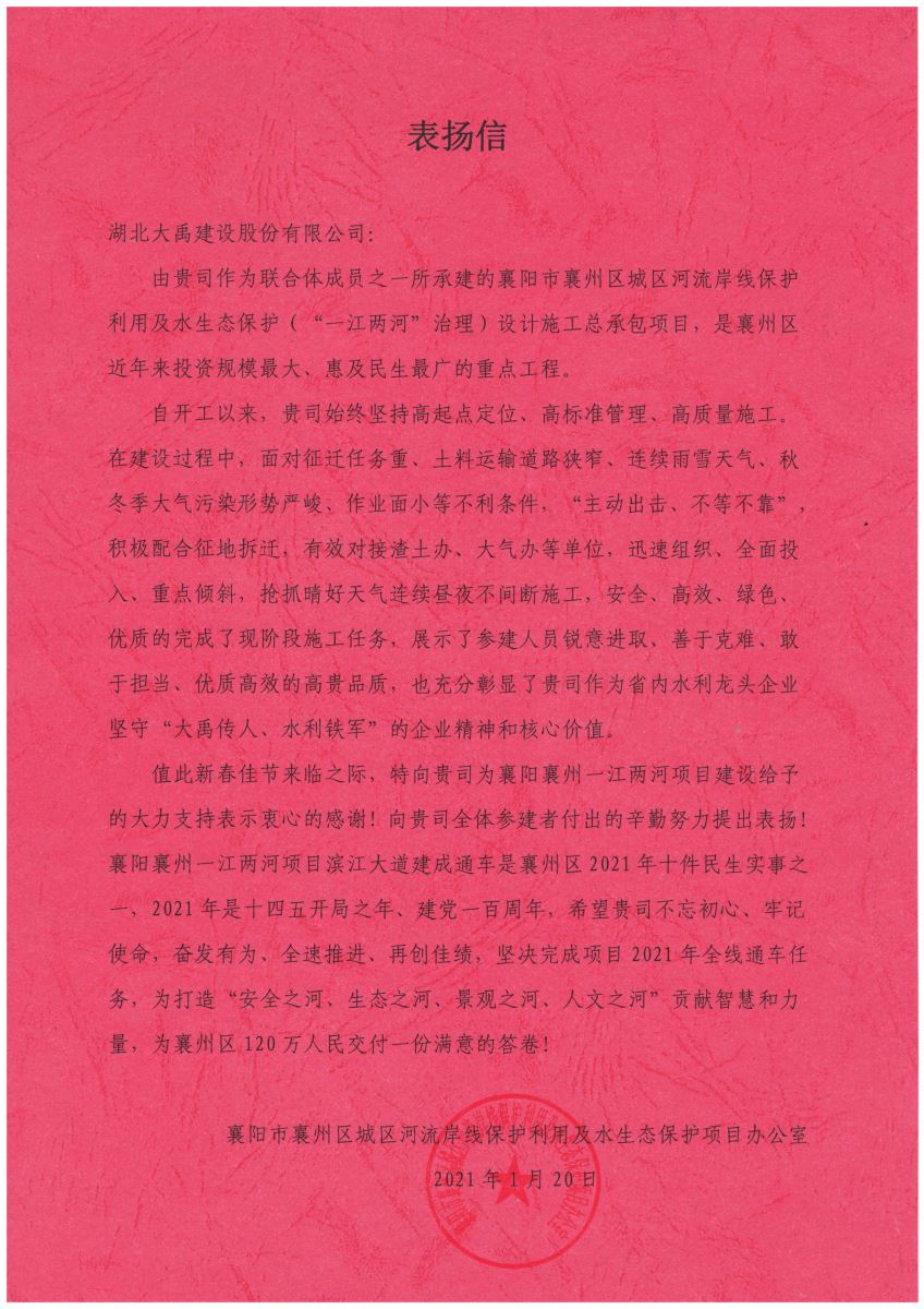 近日,襄阳市襄州区城区河流岸线保护利用及水生态保护项目办公室发来表扬信,信中高度赞扬了公司始终坚持高起点定位、高标准管理、高质量施工。在建设过程中,面对征迁任务重、土料运输道路狭窄、连续雨雪天气、秋冬季大气污染形势严峻、作业面小等不利条件,“主动出击、 不等不靠”,积极配合征地拆迁,有效对接渣土办、大气办等单位,迅速组织、全面投入、重点倾斜,抢抓晴好天气连续昼夜不间断施工,安全、高效、绿色、优质的完成了现阶段施工任务,展示了参建人员锐意进取、善于克难、敢于担当、优质高效的高贵品质,也充分彰显了公司作为省内水利龙头企业坚守“大禹传人、水利铁军”的企业精神和核心价值。