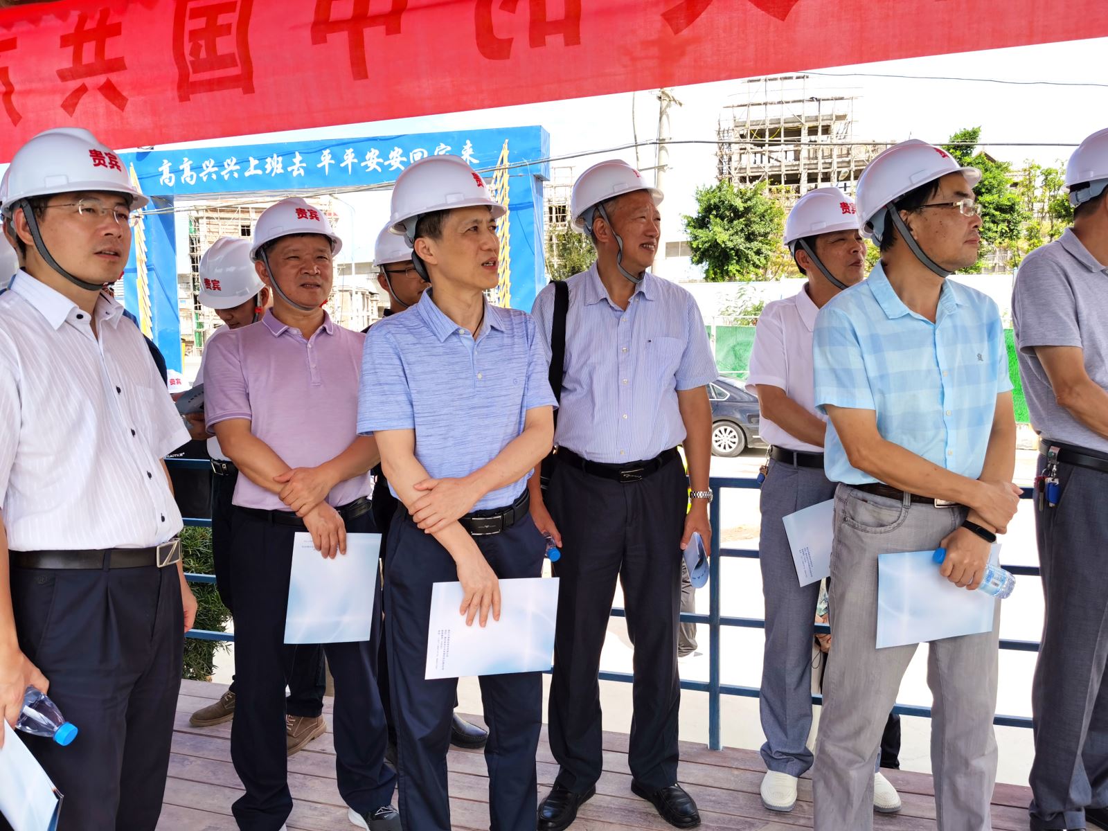 领导们一行顶着烈日、冒着酷暑来到项目施工现场,听取了建设单位及施工单位的汇报,随后查看了泵站、外引渠、水闸施工情况,了解到泵站流道钢衬已安装到位,泵站廊道采用MPS多脉冲防水系统新工艺,水闸一期右岸五孔水下部分施工已完成,具备过水度汛条件。对工程质量、安全文明施工所做的工作表示肯定,对施工单位创建标准化工地所做的工作表示赞许。