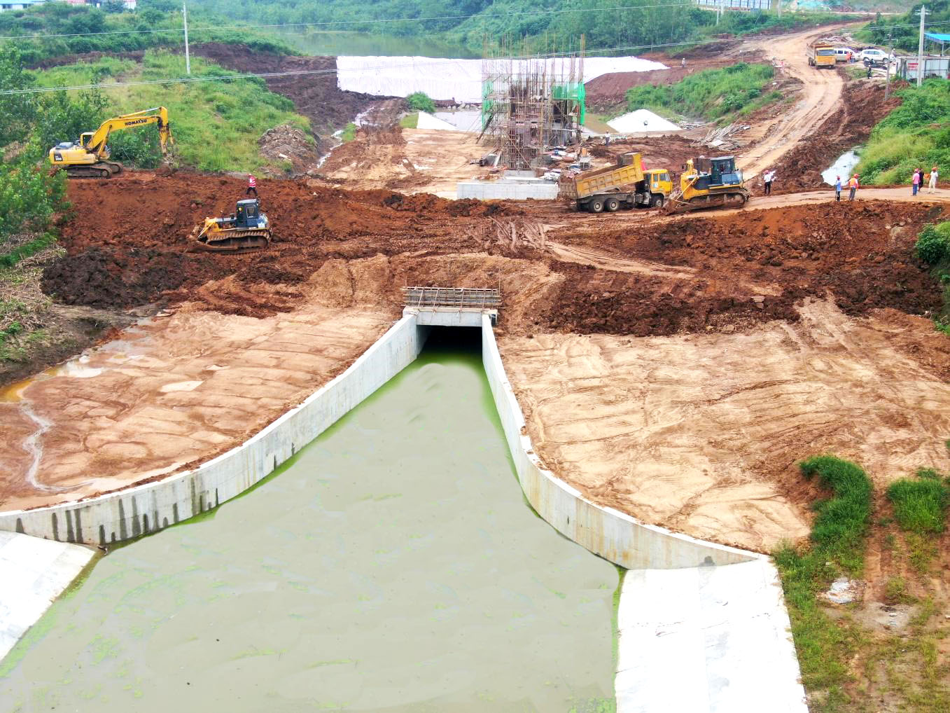 24日下午13时,巡查发现沿山闸老闸有渗漏现象,我项目部立即上报隐患,参建各方现场紧急商讨处理措施。一是项目部立即对渗漏点进行封堵回填;二是对新建沿山闸上、下游围堰进行加高培厚;三是新建沿山闸下闸挡水。项目部投入挖掘机9台,自卸车16台,推土机4台,装载机4台,振动碾2台,抢险管理人员30余人。至25日凌晨4时,新建沿山闸上游围堰填筑至48m高程,用彩条布覆盖沙袋压实,新建沿山闸完成下闸,25日晚23时,新建沿山闸下游回填至50m高程,用彩条布覆盖沙袋压实。目前沿山闸上游围堰挡水正常。