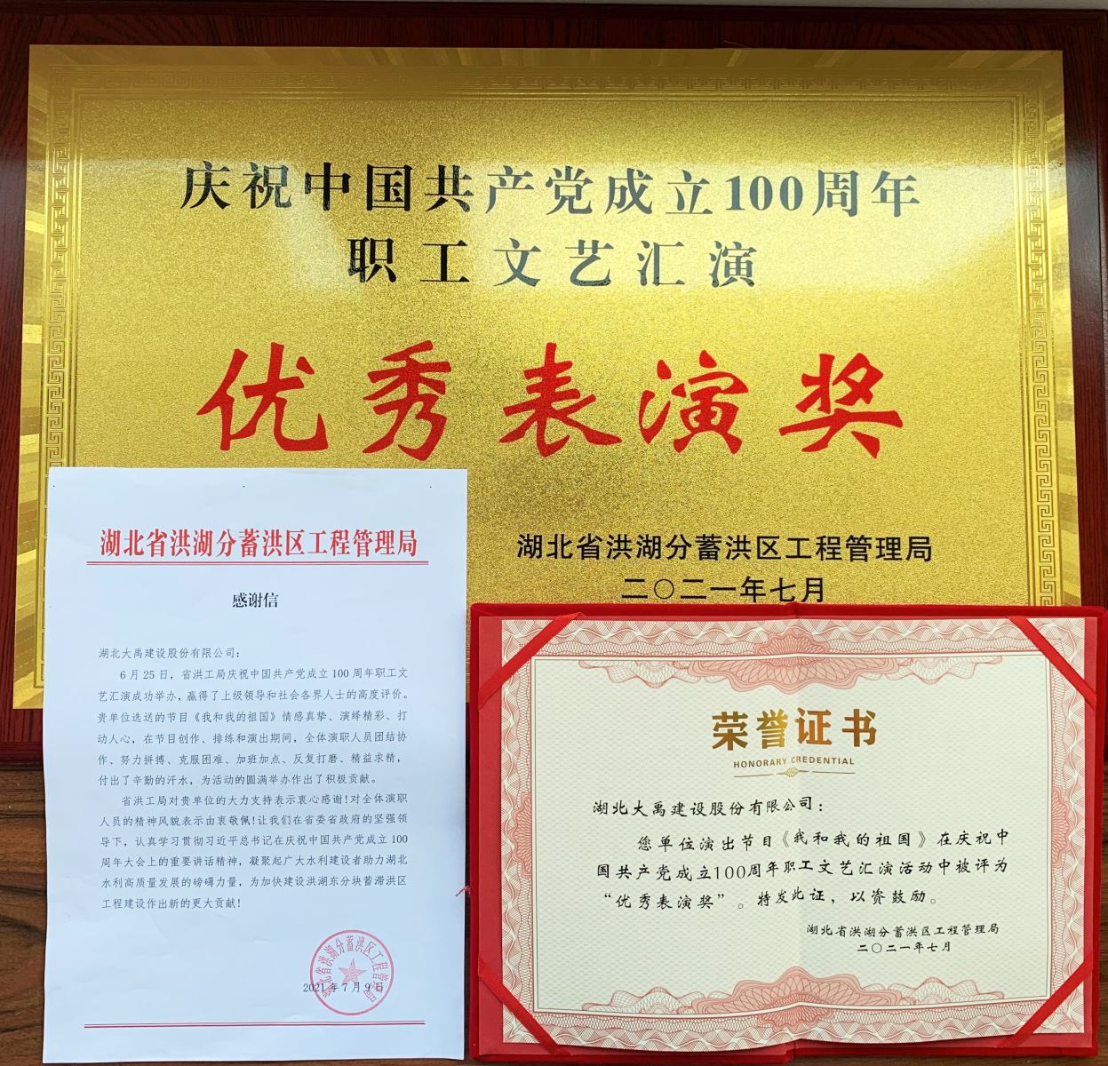 胸怀千秋伟业,恰是百年风华。为迎接中国共产党成立100周年,在公司积极号召、精心安排下,组织了多项建党活动。近日,收到省洪工局发来的荣誉证书及感谢信,公司在庆祝建党100周年职工文艺汇演活动中参演的节目歌伴舞《我和我的祖国》荣获“优秀表演奖”。