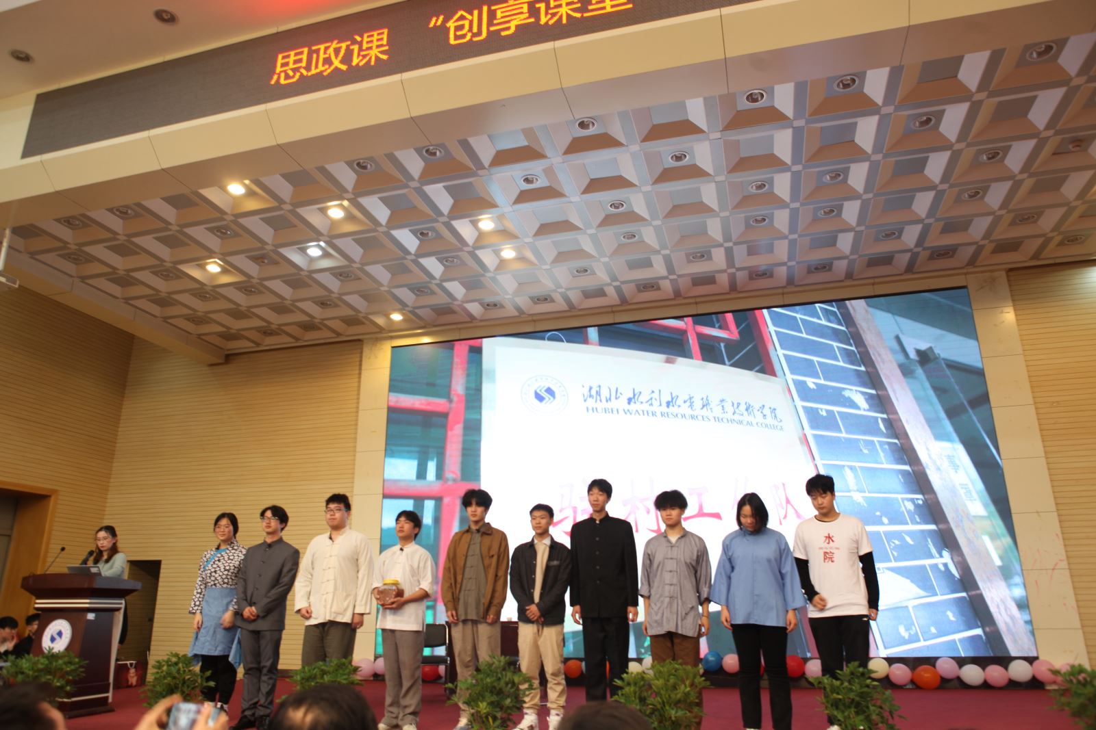 下午,胡刚一行在汤逊湖报告厅观看了大禹订单班有真实故事改编的“创享”课堂舞台剧《向幸福出发》,该剧讲述了水职院驻村工作队在英山县金家铺镇乐家冲村进行驻村帮扶工作时的情景。真实表现了水职院驻村工作队矢志扎根农村、心系群众、真帮实扶的生动实践。学生的倾情表演令在场观众为之动容,体会到了水职院将充分运用高校资源、精准发力,全面助力乡村振兴工程的决心,博得现场阵阵掌声。