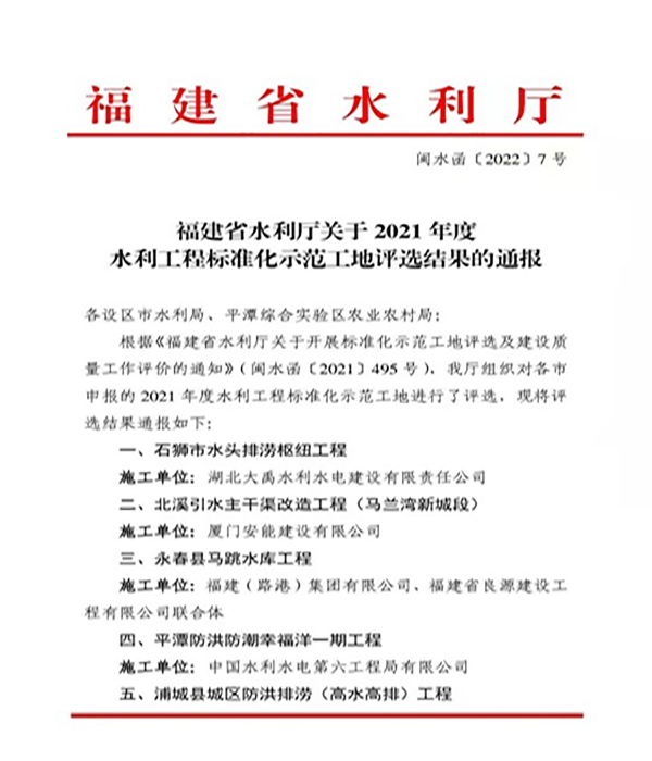 ​2022年1月6日,福建省水利厅发文通报了2021年度水利工程标准化示范工地的评选结果。石狮市水头排涝枢纽工程以总分排名第一的位置被评为2021年度水利工程标准化示范工地。