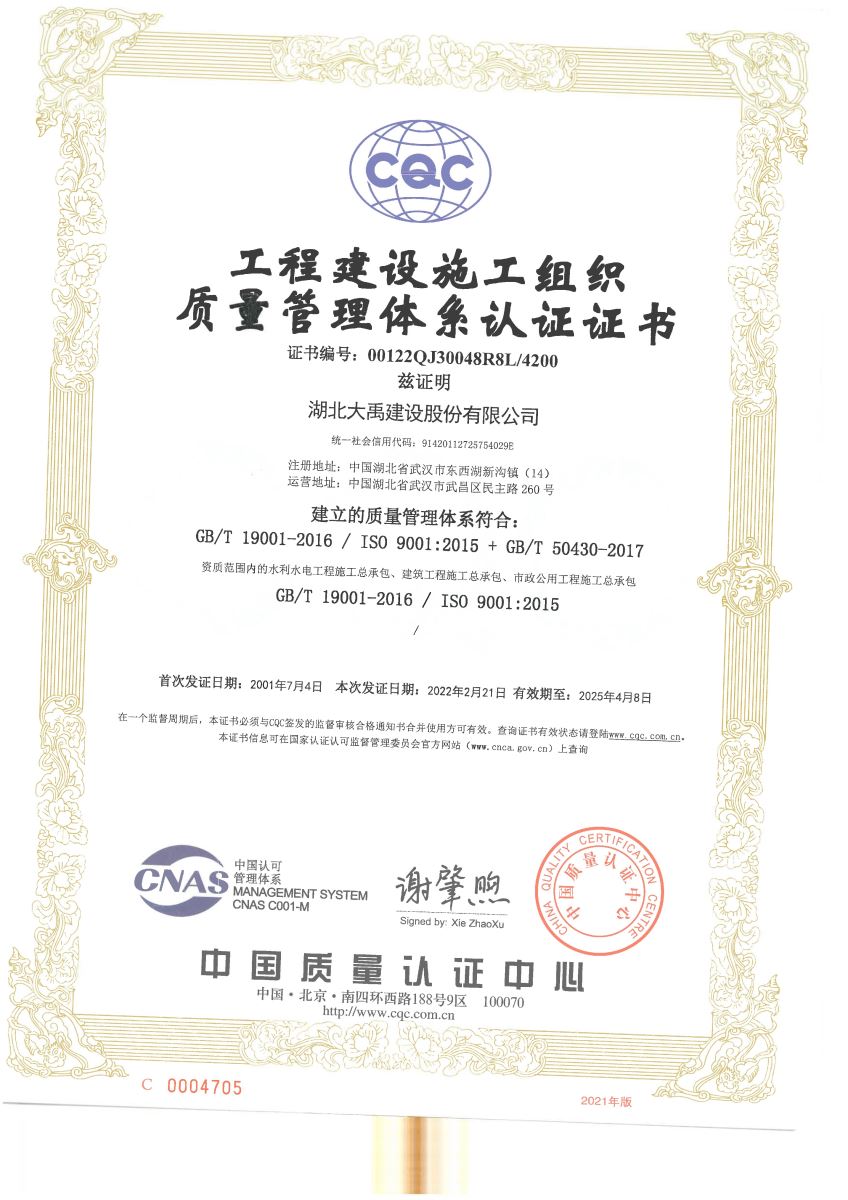 ​    2022年3月,公司再获由质量认证机构颁发的质量管理体系、环境管理体系认证和职业健康安全管理体系认证证书,此项证书标志着公司顺利通过质量管理体系认证(GB/T19001-2016、GB/T 50430-2017)、环境管理体系认证(GB/T24001-2016)和职业健康安全管理体系认证(GB/T 45001-2020)工作。