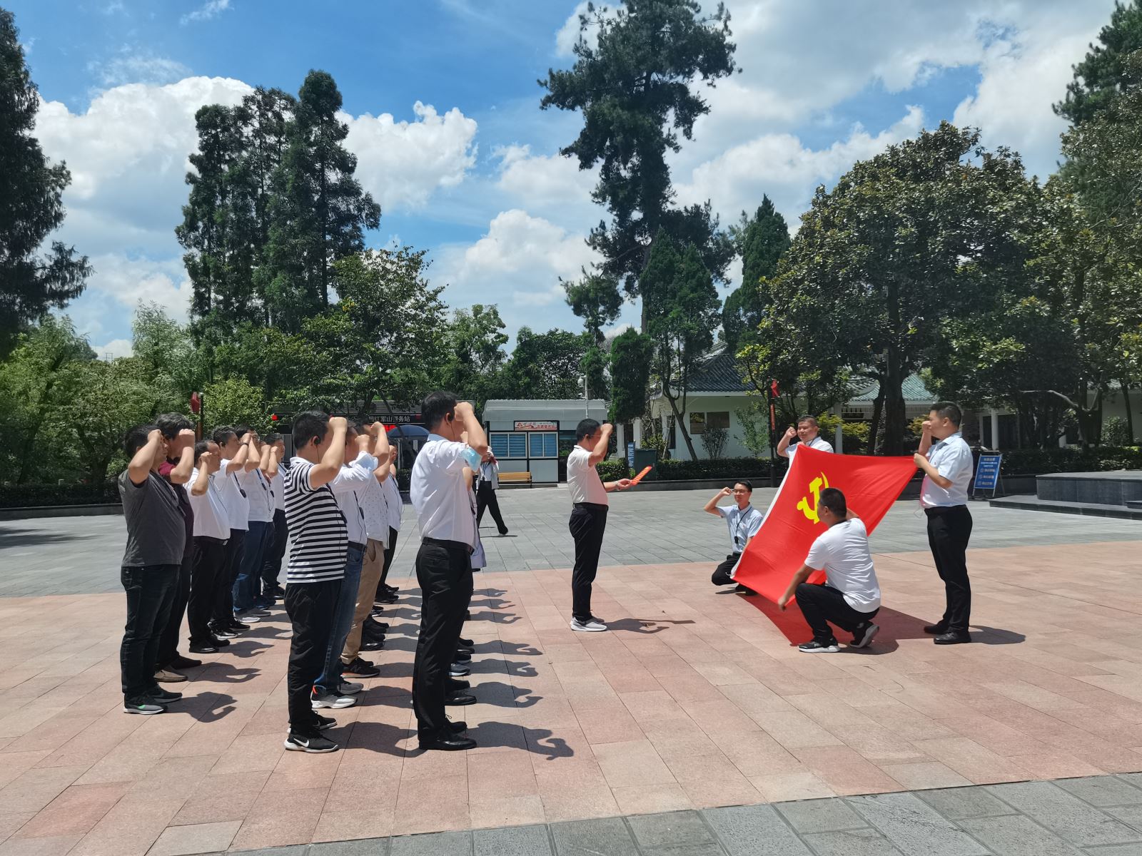 始建于1959年的遵义红军山烈士陵园安放着红军烈士遗骨,青松翠柏环抱。在庄严肃穆的氛围中,在讲解员深情并茂的引导下,大家在纪念碑前默哀,带着这份崇敬之情,由公司党委书记周运奎同志带领大家重温入党誓词,全体党员在烈士纪念碑前举行了庄严的宣誓活动。我们再次发出神圣的誓言:我志愿加入中国共产党,拥护党的纲领,遵守党的章程,履行党员义务,执行党的决定,严守党的纪律,保守党的秘密,对党忠诚,积极工作,为共产主义奋斗终身,随时准备为党和人民牺牲一切,永不叛党。这一次宣誓,更加牢固树立了理想信念,更加深刻铭记了党员的使命。纪念碑前的汉白玉浮雕,记录了红军四渡赤水、遵义人民喜迎红军、娄山关大捷、强渡乌江等历史场景,大家一一瞻仰,一同回顾革命前辈艰苦奋斗的光辉历程,深切缅怀革命先烈的丰功伟绩。
