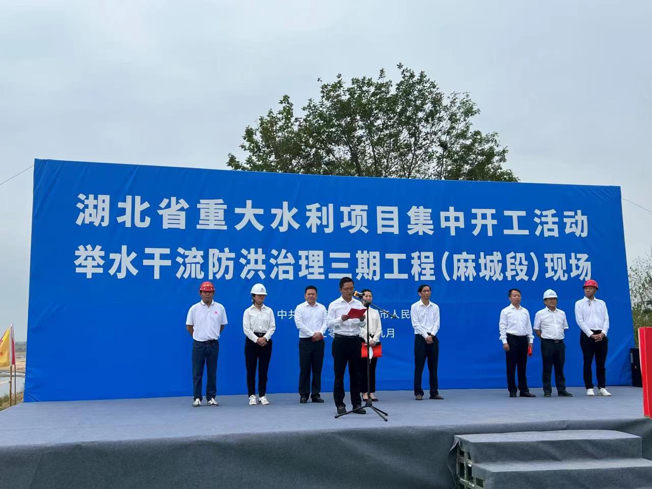 9月21日上午,全省举行重大水利项目集中开工活动,全省集中开工的19个水利项目中,黄冈市占3个,总投资39.9亿元。其中举水干流防洪治理三期工程于当日上午10点在麻城市宋埠镇李钊村举行开工仪式。黄冈市委常委、市委办主任周斐,市政府副市长吴静,市政府党组成员陈焕文等领导列席开工仪式并发表讲话。公司副总经理傅高林参加开工仪式。