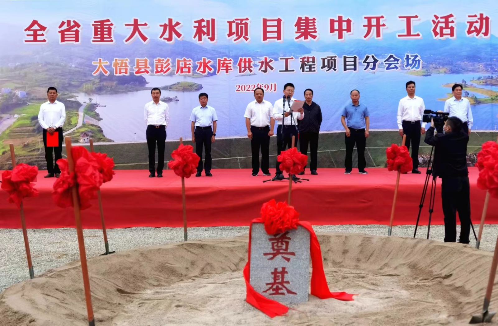 9月21日,全省重大水利项目大悟县彭店水库供水工程项目开工仪式在大悟县彭店乡隆重举行。大悟县水利和湖泊局局长丁卫东在开工仪式上介绍项目基本情况,县委书记余海群同志宣布大悟县彭店水库供水工程项目正式开工,大悟县副县长李强主持开工活动。省水利厅饮水中心一级调研员陈协清列席开工仪式并做讲话,公司项目负责人作为施工方代表参加开工仪式。