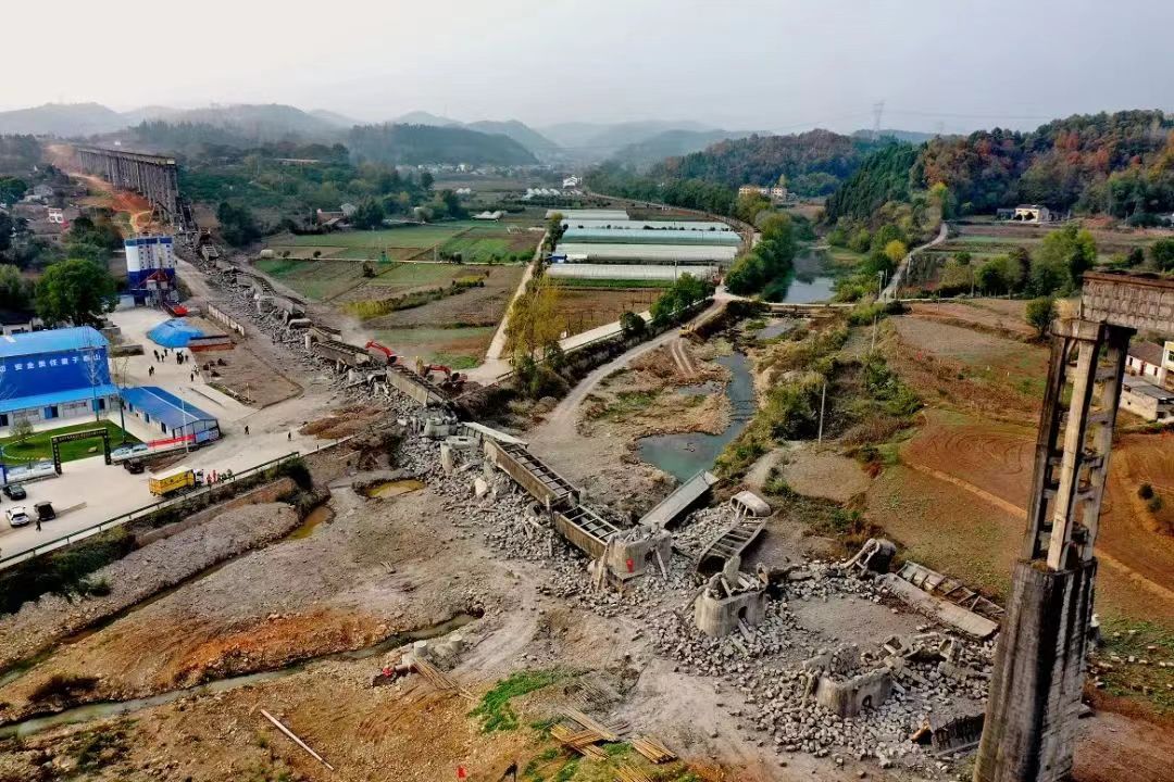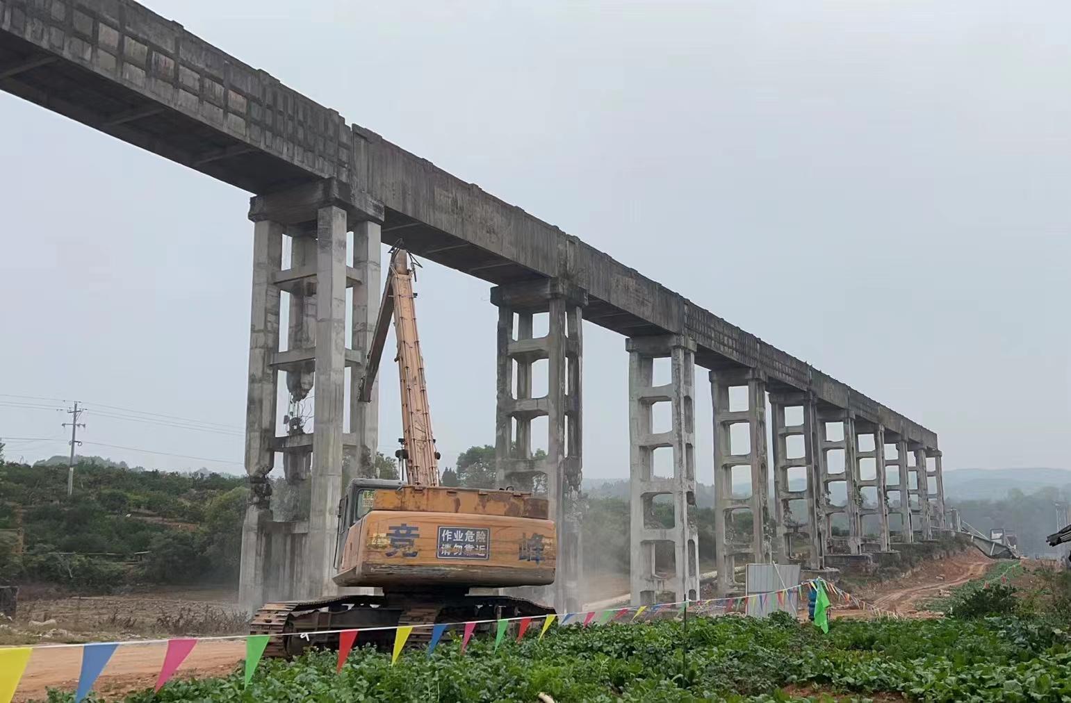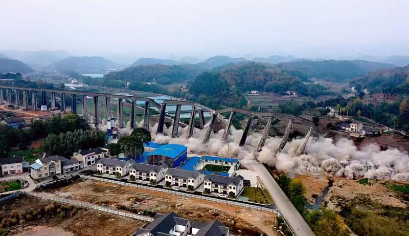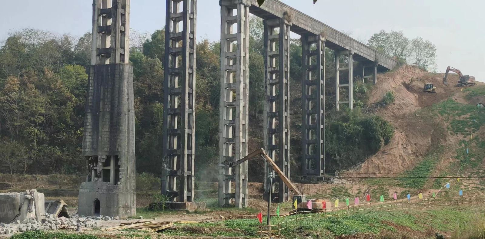 此次拆除的67个原渡槽槽墩,其中23个空心墩于11月17日成功进行爆破拆除,余下排架柱在11月17日至19日全部采用机械拆除完成。现阶段正在进行渡槽拆除后残渣的清理工作,预计11月25日清理完成。