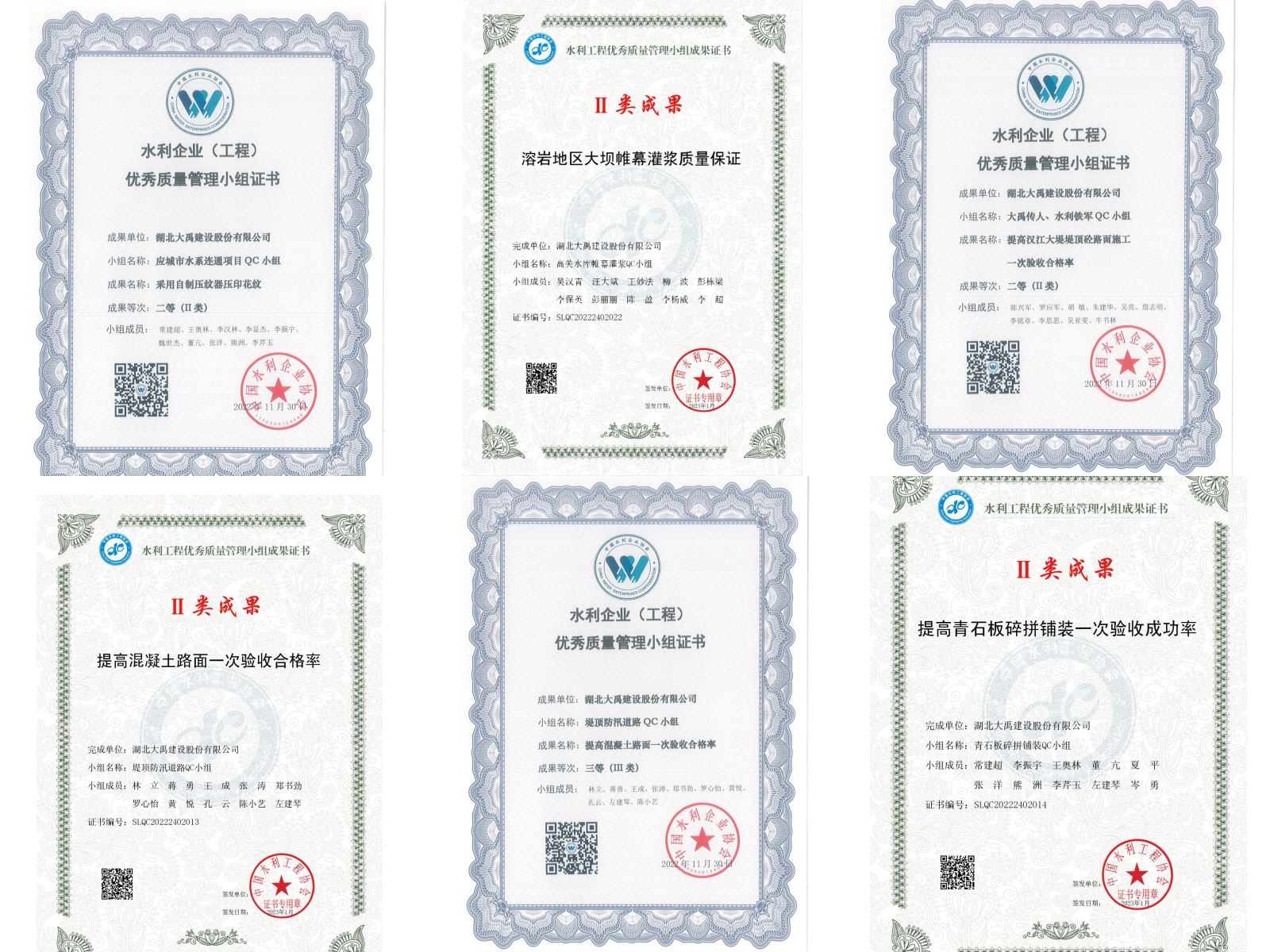 2023年1月,中国水利工程协会通过经初审、资料评价、发表评价和评价委员会审定,最终确定1052项水利工程优秀质量管理小组成果,其中公司有3项成果获奖,分别是《提高混凝土路面一次验收合格率》(荣获Ⅱ类成果)、《提高青石板碎拼铺装一次验收成功率成功率》(荣获Ⅱ类成果)和《溶岩地区大坝帷幕灌浆质量保证》(荣获Ⅱ类成果)。