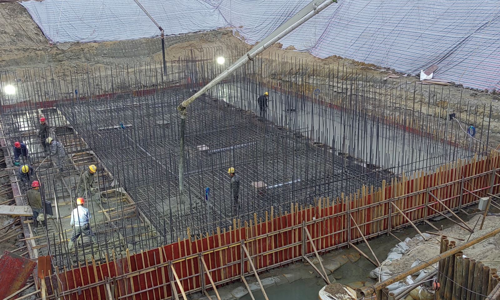 本次混凝土浇筑采用商品混凝土,2台天泵同时进行施工,从上午11时开仓至晚上9时收面、覆盖完成,连续浇筑约10个小时,累计浇筑混凝土方量约600立方米。底板混凝土浇筑工作的顺利完成,奠定了工程项目在本年度汛期安全度汛中最坚实的一步,标志着老河二站工程即将进入施工难度最大的阶段,也是本工程中的重点部位及进水流道层混凝土的施工阶段。