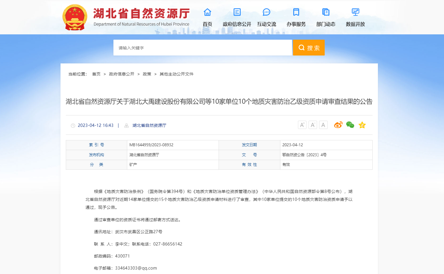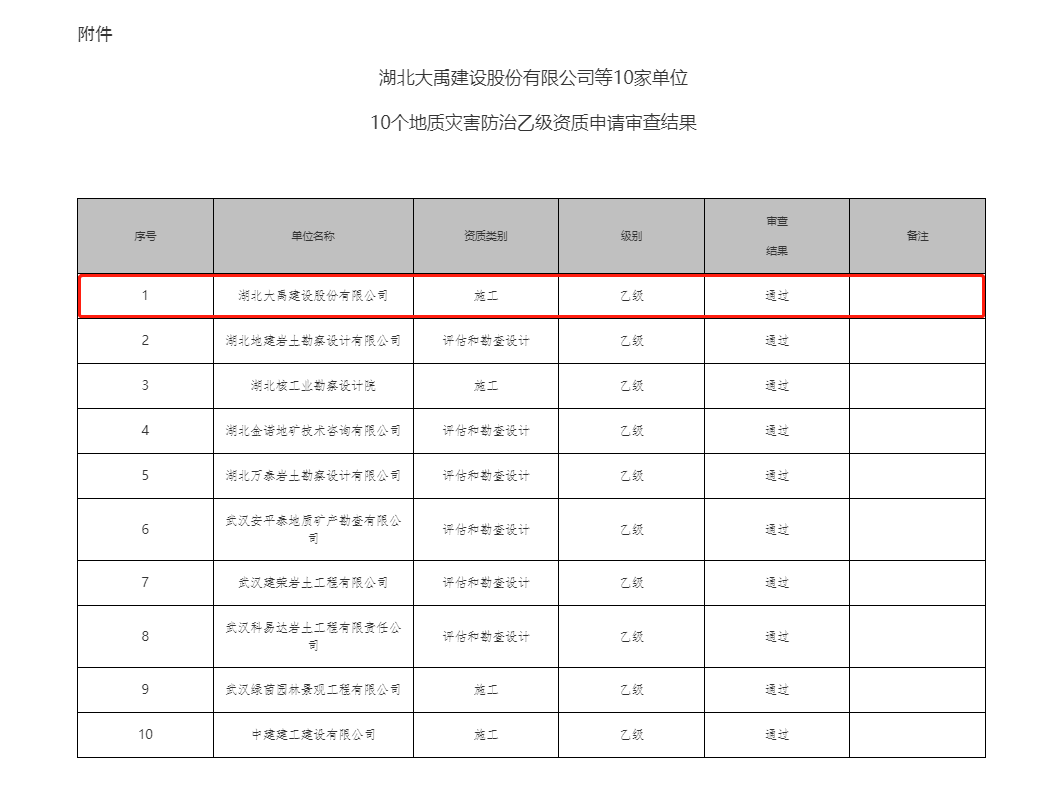 近日,湖北大禹建设股份有限公司资质升级工作再传喜讯,通过了湖北省自然资源厅的审查,获得地质灾害防治工程施工乙级资质,这是公司在建筑企业资质升级工作中取得的又一项重要成果,是公司在工程承揽方面取得的又一次重大突破!