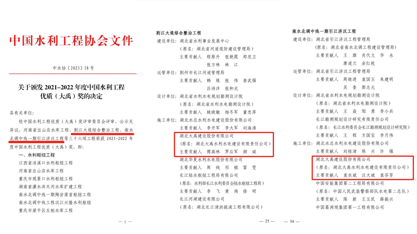 5月5日,中国水利工程协会发布《关于颁发2021-2022年度中国水利工程优质(大禹)奖的决定》(中水协〔2023〕18号),公司参建的南水北调中线一期引江济汉工程、荆江大堤综合整治工程两项工程荣获中国水利工程优质(大禹)奖。
