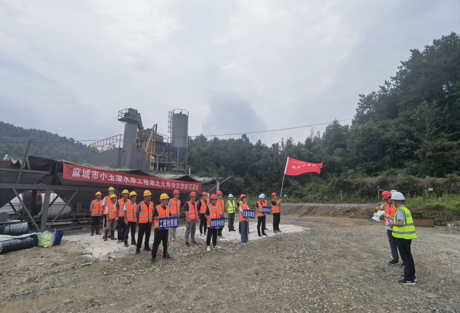 ​为提高广大职工防汛抗洪应急抢险能力、维护施工现场物资及人民群众生命财产安全,湖北大禹小玉潭项目部在麻城市水利和湖泊局有关领导的支持下开展2023年防汛抢险应急演练。为切实做好现场防汛应急处置工作,统筹防汛力量,不断提升麻城小玉潭工程度汛指挥部决策、组织调度、应急处置能力打下演练基础。