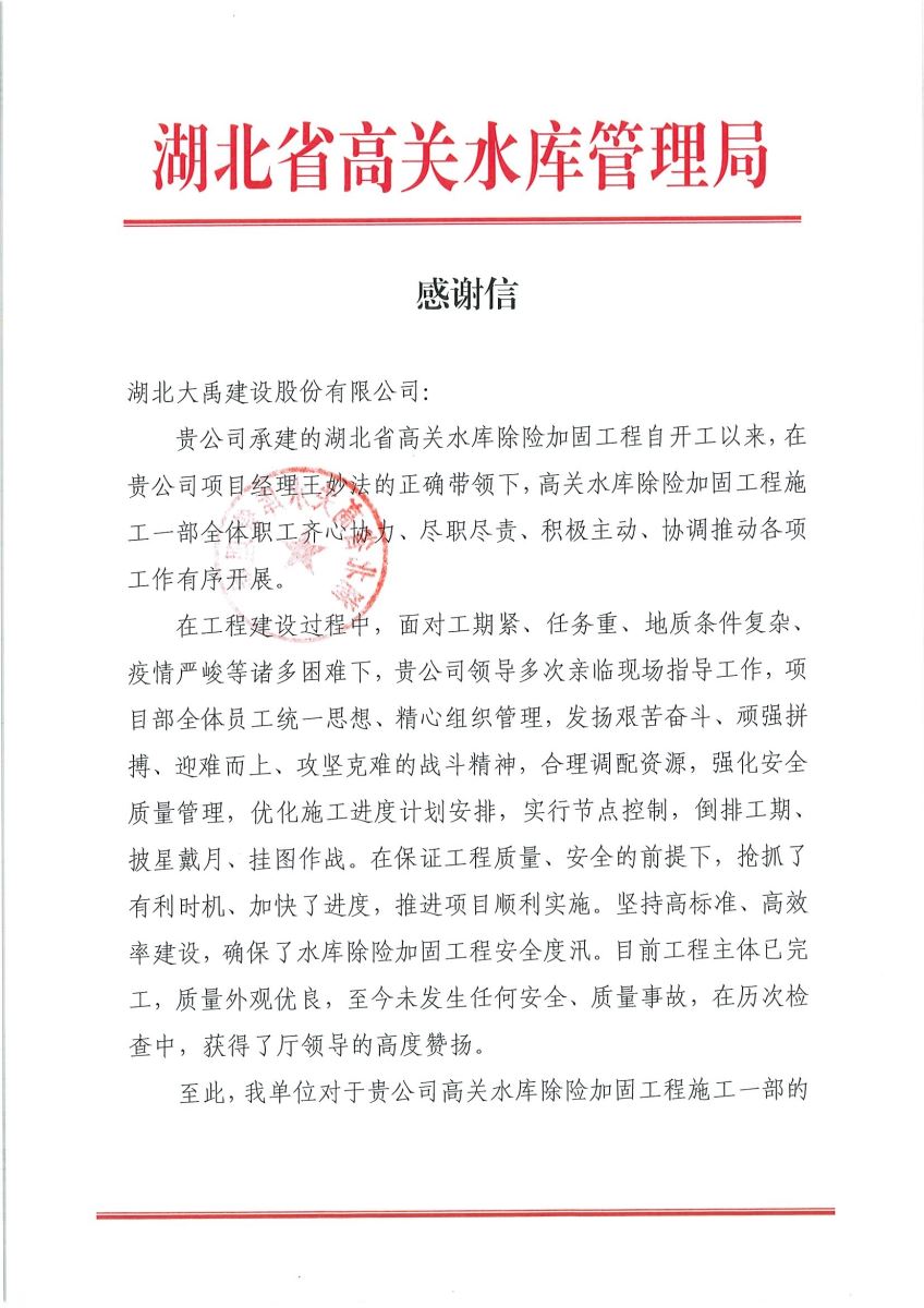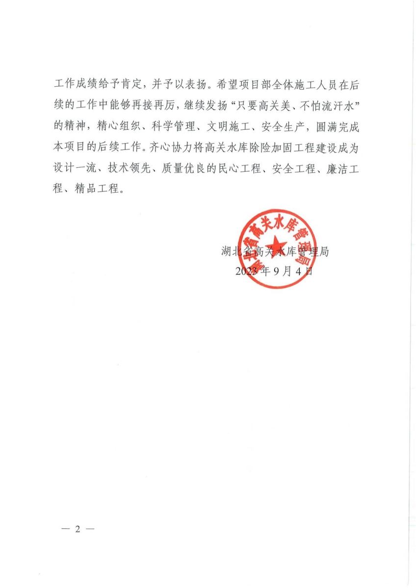 信中指出,在工程建设过程中,面对工期紧、任务重、地质条件复杂、疫情严峻等诸多困难下,项目部全体员工统一思想、精心组织管理,发扬艰苦奋斗、顽强拼搏、迎难而上、攻坚克难的战斗精神,合理调配资源,强化安全质量管理,优化施工进度计划安排,实行节点控制,在保证工程质量、安全的前提下,抢抓了有利时机、加快了进度,推进项目顺利实施。坚持高标准、高效率建设,确保了水库除险加固工程安全度汛,至今未发生任何安全、质量事故,在历次检查中,获得了厅领导的高度赞扬。