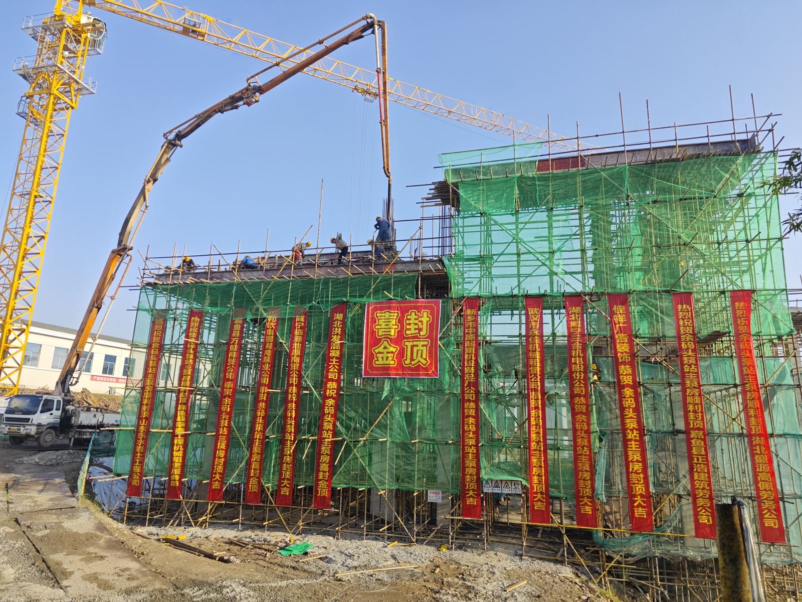 11月27日,伴随着最后一方混凝土的浇筑完成,在业主、设计、监理、施工等各方的见证下,嘉鱼县余码头泵站更新改造工程厂房顺利封顶,这是继本月20日防洪闸启闭机房封顶后的又一重要工程节点。