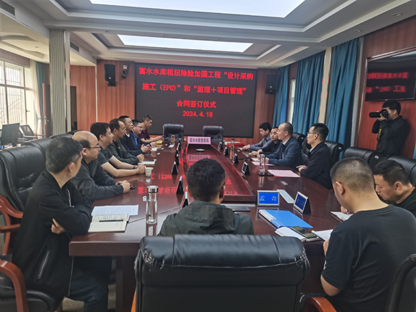 4月18日,富水水库枢纽除险加固工程“设计采购施工(EPC)”和“监理+项目管理”合同签约仪式在富水水库防汛楼成功举行。富水水库管理局局长李凯以及各参建单位相关负责人出席签约仪式。公司党委书记、董事长周运奎代表公司签约。