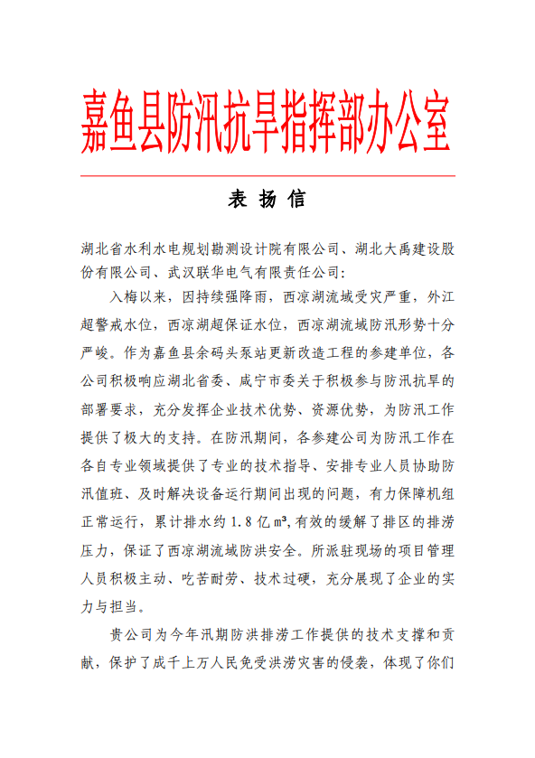 信中指出,入梅以来,因持续强降雨,西凉湖流域受灾严重,外江超警戒水位,西凉湖超保证水位,西凉湖流域防汛形势十分严峻。作为嘉鱼县余码头泵站更新改造工程的参建单位,大禹公司积极响应湖北省委、咸宁市委关于积极参与防汛抗旱的部署要求,充分发挥企业技术优势、资源优势,为防汛工作提供了极大的支持。在防汛期间,为防汛工作提供了专业的技术指导、安排专业人员协助防汛值班、及时解决设备运行期间出现的问题,有力保障机组正常运行,累计排水约1.8亿m³,有效的缓解了排区的排涝压力,保证了西凉湖流域防洪安全。所派驻现场的项目管理人员积极主动、吃苦耐劳、技术过硬,充分展现了企业的实力与担当。