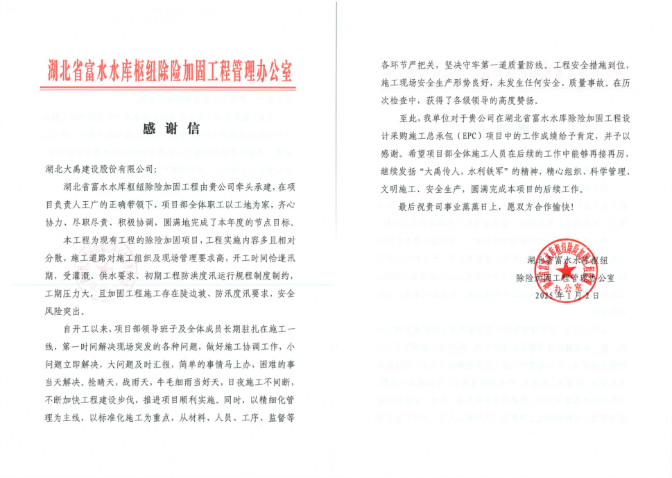 近日,公司收到省富水水库除险加固工程管理办发来的感谢信,信中充分肯定了项目部全体员工以工地为家,齐心协力、尽职尽责、积极协调,圆满地完成了本年度的节点目标。对公司工作成绩给予肯定,并予以感谢。希望项目部全体施工人员在后续的工作中能够再接再厉,继续发扬“大禹传人,水利铁军”的精神,精心组织、科学管理、文明施工、安全生产,圆满完成本项目的后续工作。